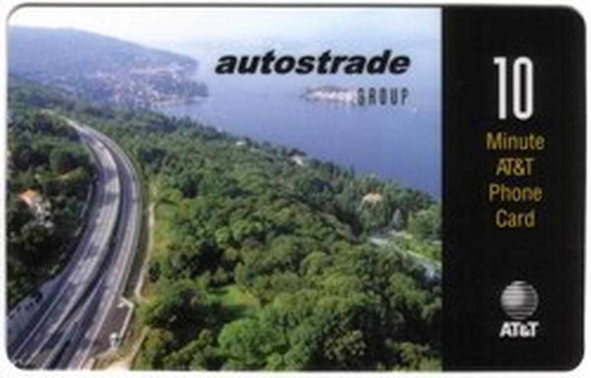 The phone card is issued by AT&T and carries a value of 10m, suggesting a prepaid credit measure. The word “SPECIMEN” appears on the front of the card, indicating it is a sample or demonstration version. The AT&T logo is prominently displayed, confirming the card's telecommunications affiliation. The overall composition emphasizes the natural beauty surrounding the Autostrade motorway, highlighting the relationship between infrastructure and environment.