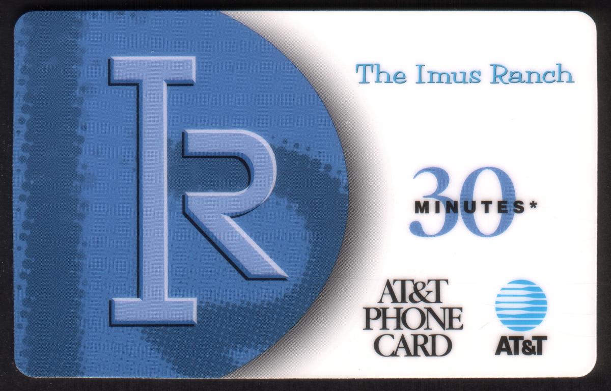 This collectible promotional phone card features a colorful graphic design with the title "PROMOTIONAL 30M IR The Imus Ranch SPECIMEN" prominently displayed near the top center. The card includes the name "AT&T" in bold letters, indicating the telecommunications company associated with the card. The design incorporates a stylized representation of a cowboy hat above the text, reinforcing the ranch-themed motif. The overall color scheme uses shades of red, white, and blue.