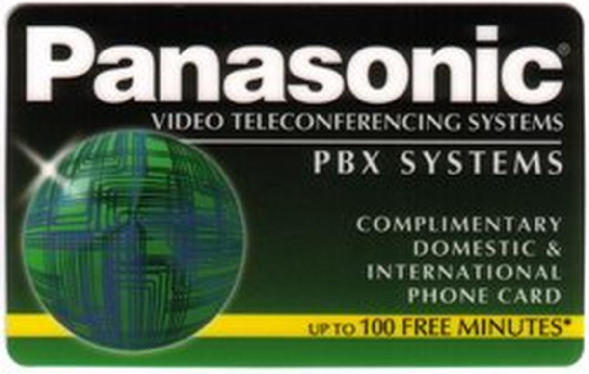 No personal names or characters are displayed. The card represents a specialized offering connected to AT&T’s telephony solutions, particularly promoting Panasonic video teleconferencing and PBX systems usage with enhanced calling time. The words “SPECIMEN” and “promotional” are printed to indicate its purpose as a trial or sample card for marketing and demonstration.