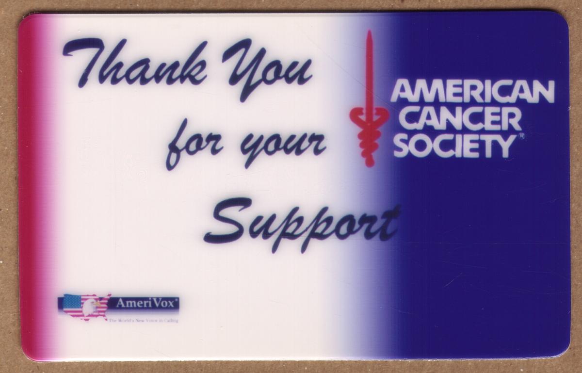 This collectible card is a promotional fundraising card issued by AmeriVox in support of the American Cancer Society. The front features a strong, clear graphic with the message, "Thank You For Your Support," displayed prominently. The name "American Cancer Society" appears below the supporting message, indicating the card’s purpose in aiding awareness and fundraising efforts for the disease-fighting organization.