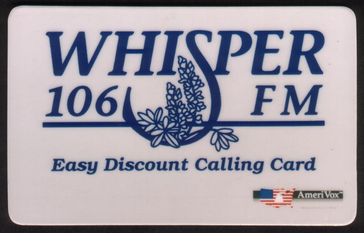 This collectible phone card features the logo and branding of Whisper 106 FM Radio, a radio station promoting easy discount calling services. The card is identified as an "Easy Discount Calling Card" and dates from 1992. The front design prominently displays the Whisper 106 FM Radio name with its distinctive branding elements. The calling card is issued by AmeriVox, as indicated by the text included on the front of the card.