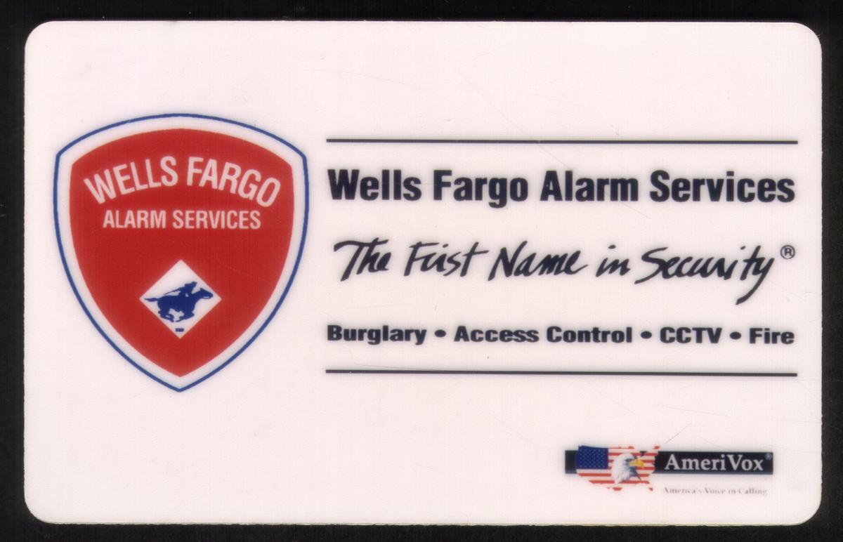 This collectible card features the Wells Fargo Alarm Services logo prominently on the left side. The logo is a red shield outlined in blue and white with the text "WELLS FARGO ALARM SERVICES" inside. Below the text in the shield is a small blue horse graphic on a white background.