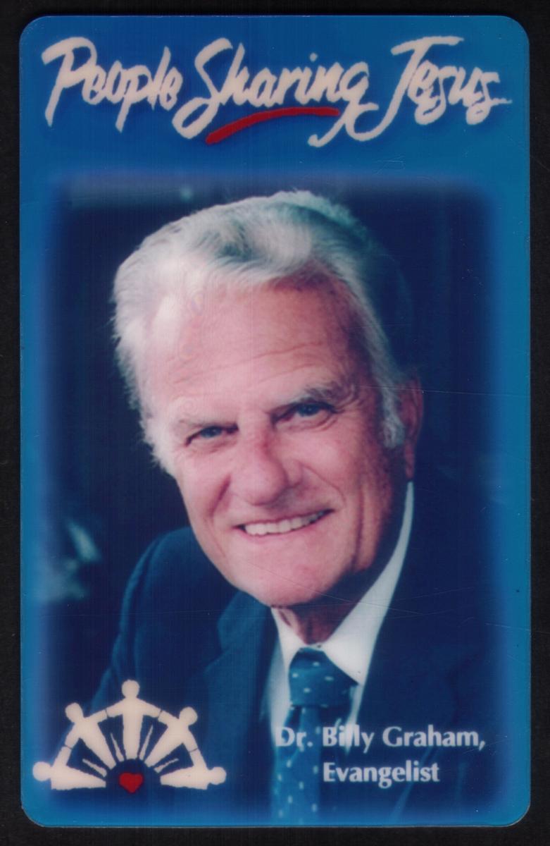 Billy Graham evangelist phone card featuring his portrait, a heart symbol, and Christian themes, highlighting his influence in evangelical outreach and televangelism. |