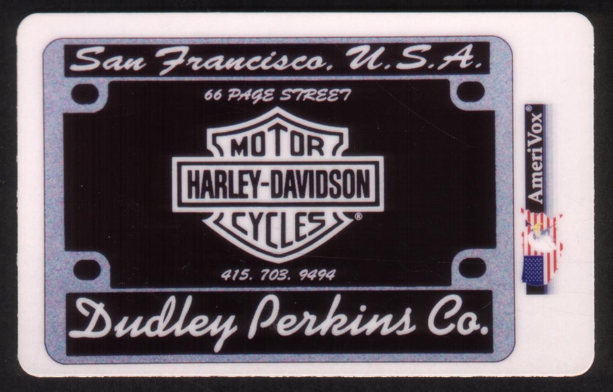 This card clearly connects to the Dudley Perkins Co, a known Harley-Davidson dealership based in San Francisco, California, and promotes Harley-Davidson motorcycles. It serves as a promotional collectible emphasizing branding and advertising related to motorcycles and biking culture.