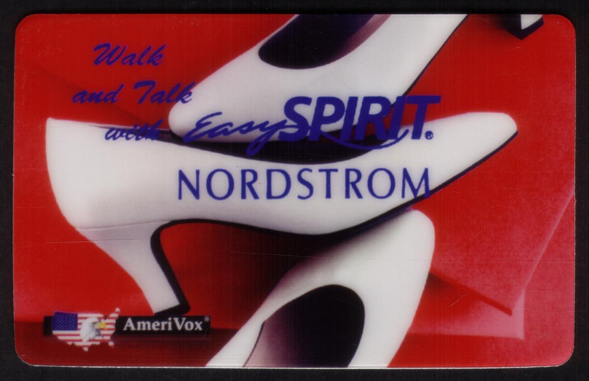 The card includes clear branding elements referencing Nordstrom, a well-known department store chain. The text “Walk And Talk With Easy Spirit” is visibly printed on the card, reinforcing the promotional nature of this item related to the retail and fashion sectors. The visual presentation highlights the shoes against a simple background, focusing attention on the product itself.