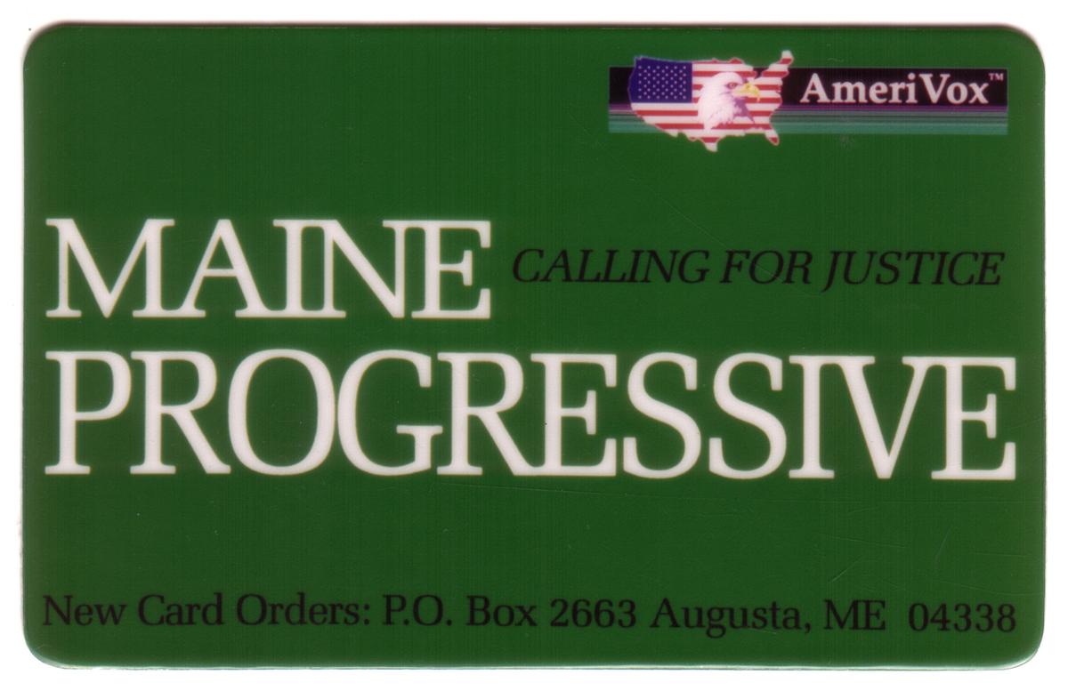 The collectible phone card titled "Maine Progressive - Calling for Justice (Sept 1993)" features a distinctive design that highlights the theme of progressive organizations in Maine. The card bears the AmeriVox logo prominently, indicating the issuing entity. The main image on the card includes multiple figures engaging in activities suggestive of advocacy or protest, illustrating the card’s focus on social justice and community action within the state of Maine.