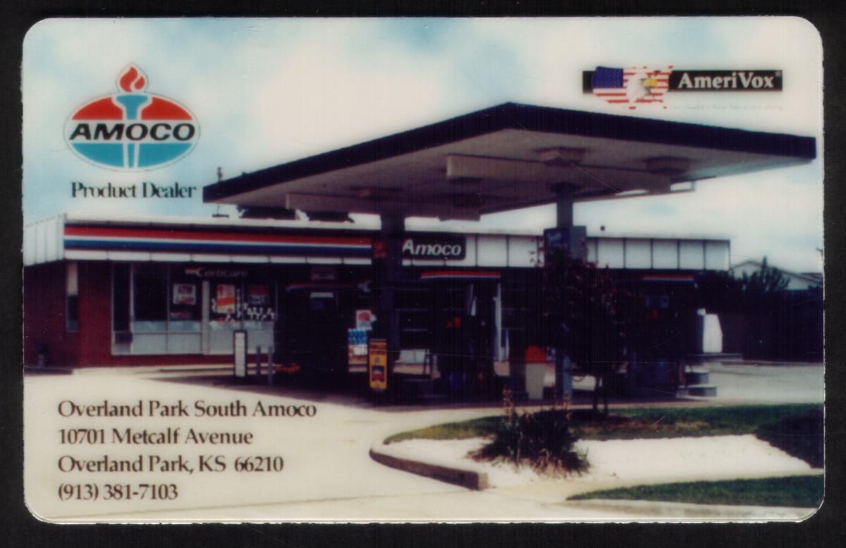 The card presents a clean layout focused on corporate branding, showing the Amoco name and logo clearly. There are no other names or imagery on the front besides the Amoco identifiers and text referencing Overland Park South Amoco Service Station. The card is produced by AmeriVox, known for creating promotional materials.