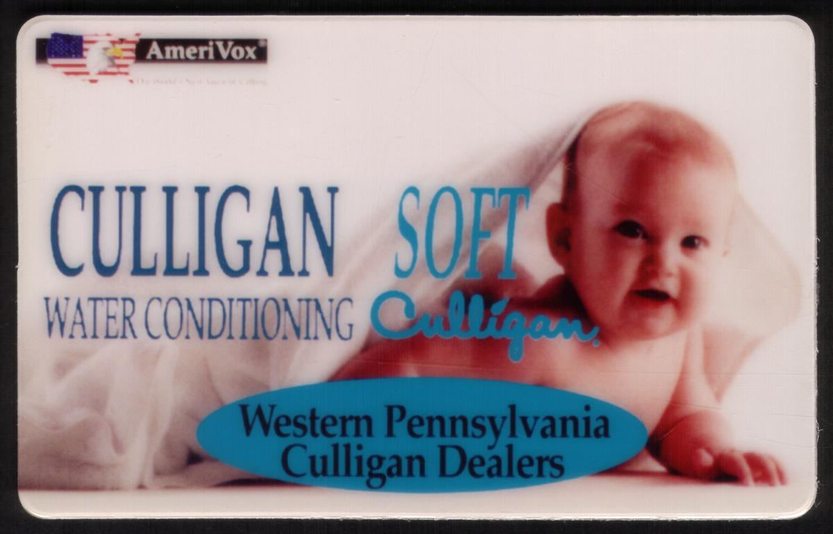This collectible phone card features the Culligan Soft Water Conditioning logo prominently in the upper left corner, alongside text that reads “Western Pennsylvania Culligan Dealers.” The card displays an image of a smiling infant with fair skin and light hair, wrapped in a soft, white towel with a blue border that partially covers the baby’s head. The background is a soft gradient of blue and white, creating a calm and gentle atmosphere that aligns with the product’s focus on water softeners and conditioners.