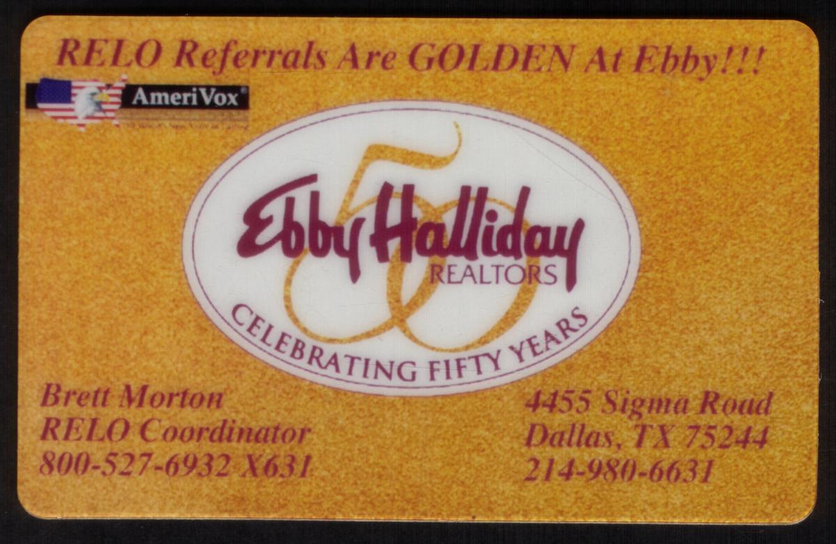 Additional text identifies this as a promotional item tied to corporate and real estate business cards, specifically targeting realtors and relocation coordinators. The card serves as both a commemorative piece and a nod to the ongoing success and network within the Ebby Halliday Realtors organization, supported by AmeriVox, with Brett Morton’s name prominently displayed to recognize individual affiliation or contribution.