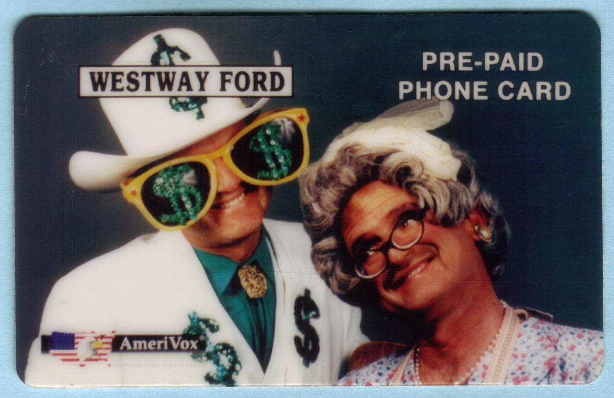 The background of the image shows a variety of automotive-related elements consistent with the atmosphere of a car dealership, including display lighting and portions of vehicle interiors or parts visible behind the woman. The card includes multiple textual elements: "Westway Ford Dealership," "Irving Texas," "PROOF," and the brand "AmeriVox" printed clearly on the card’s front side.