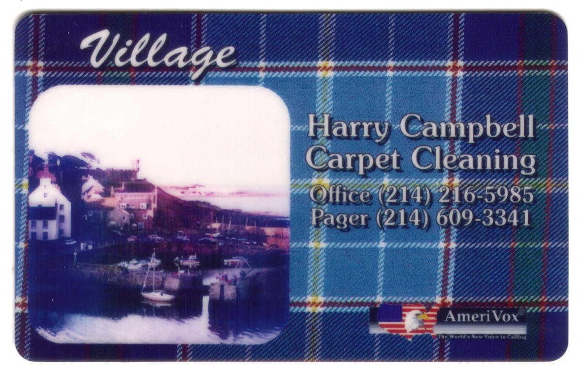 The card's text and logos are sharply printed, emphasizing the card’s promotional use for Harry Campbell Carpet Cleaning and its association with AmeriVox, making it a unique item for collectors interested in advertising and service phone cards connected to Texas-based businesses.