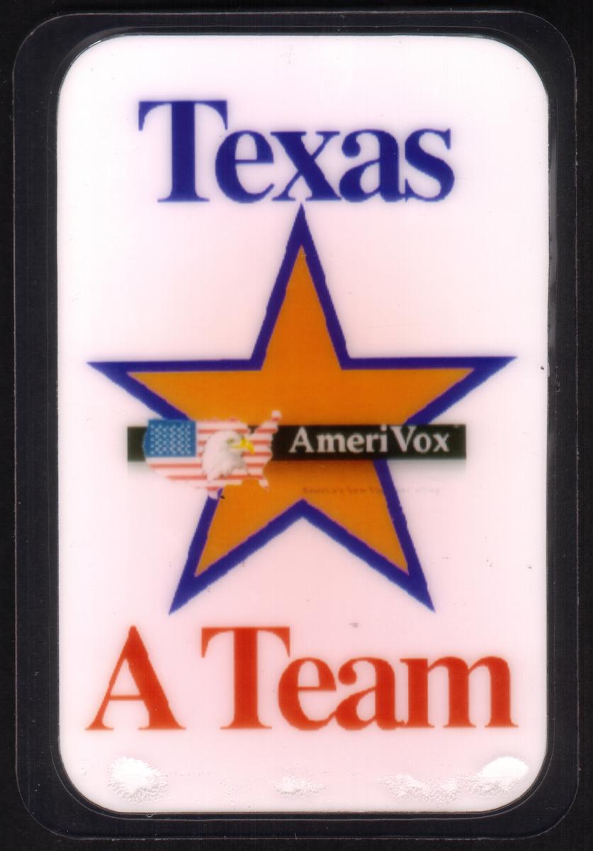 No other logos, images, or decorative elements are present on the card face beyond the AmeriVox name, the "$10" denomination, and the phrase "Texas A Team (AmeriVox Top Representatives in Texas)." This ensures that the card’s theme is strictly professional and representative of AmeriVox’s representative program within the state of Texas.