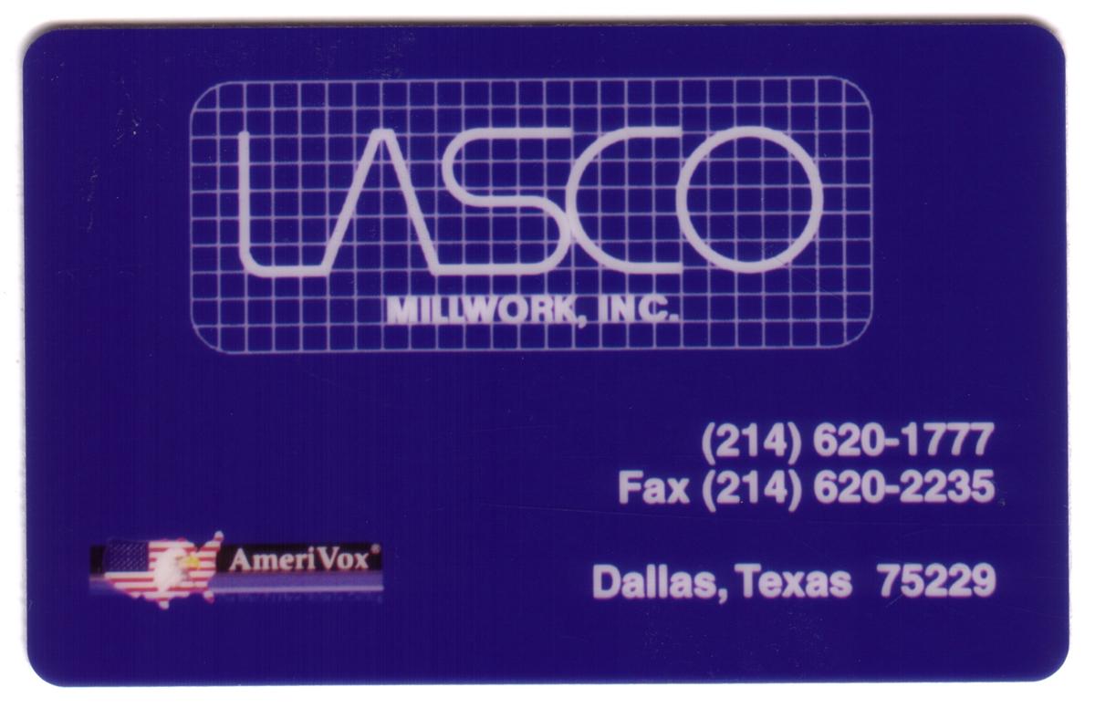 Overall, this collectible phone card serves as a corporate advertising piece for Lasco Millwork, showcasing key professional services related to homebuilding and carpentry in the Dallas area, endorsed through collaboration with AmeriVox.