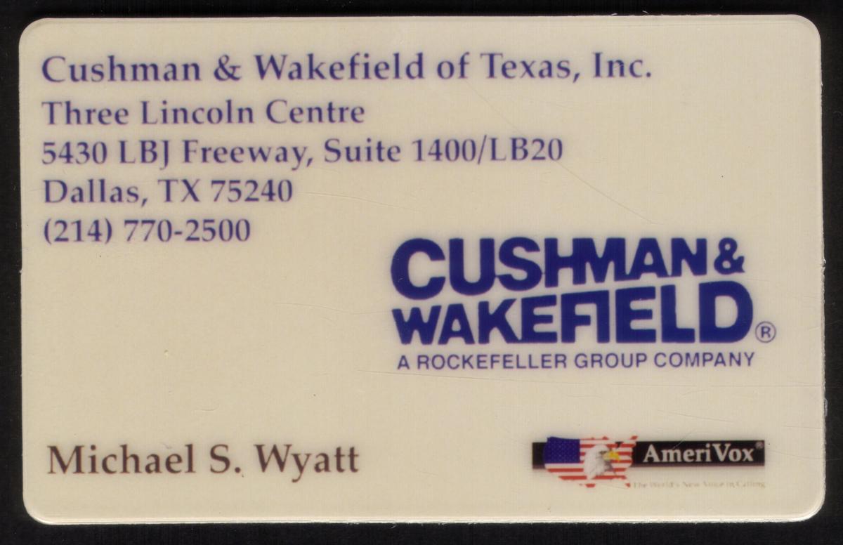 This collectible chip card features a detailed image related to Cushman & Wakefield of Texas Inc., highlighting their presence in Dallas, Texas. The card prominently displays “Cushman & Wakefield: A Rockefeller Group Company” along with the name Michael S. Wyatt, associated with AmeriVox, indicating a connection to real estate capital market services. The card includes reference to Lincoln Centre, a known commercial real estate complex, suggesting a focus on corporate or commercial real estate.