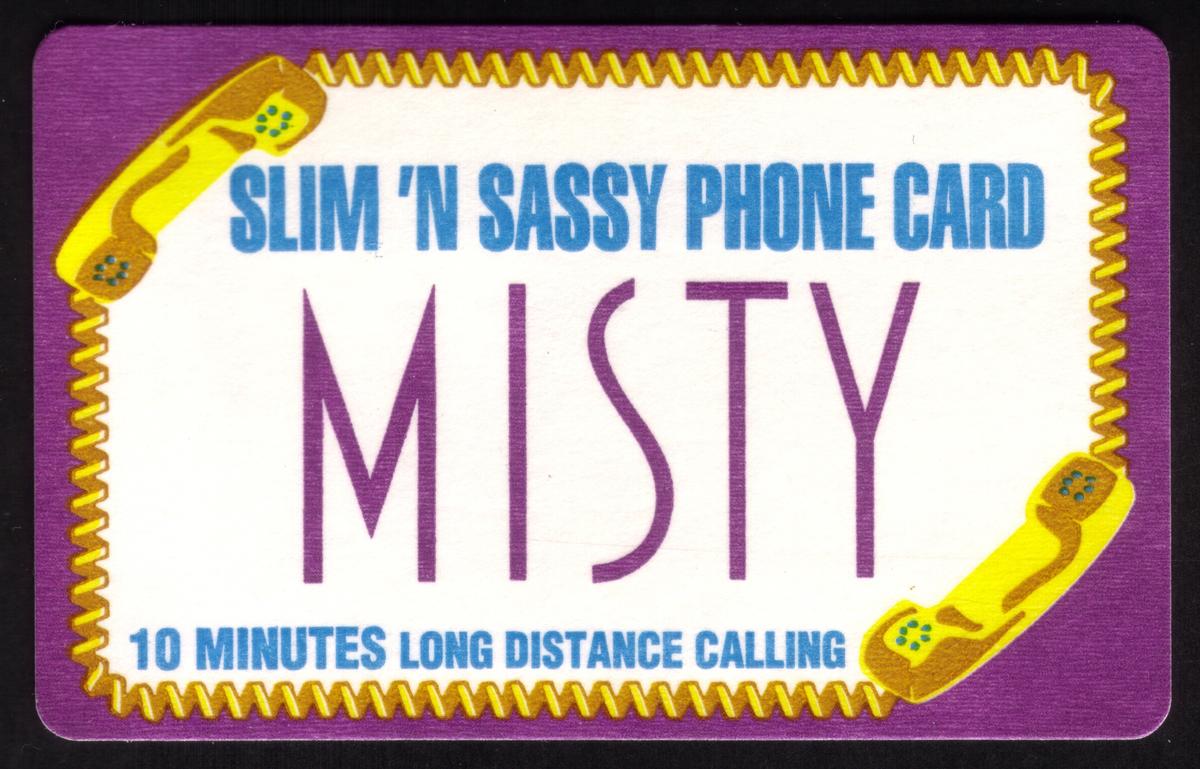 This collectible promotional phone card features branding for the American Tobacco Company, specifically advertising Misty Lights Cigarettes. The card highlights a giveaway campaign from 1994, displaying the phrase "Slim 'N Sassy Phone Card" prominently on the front. The overall design uses a combination of soft pastel lavender and purple tones, with the Misty Lights Cigarettes logo positioned near the top left corner.