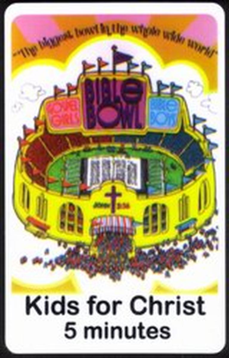 The medal in the center resembles the shape of a large bowl, described as "the biggest bowl in the whole wide world," symbolizing the Bible Bowl event. The design’s vibrant colors and artistic style convey a lively, inviting tone aimed at a younger audience interested in Christianity and Bible study. The use of the words "religious," "Christian," and "Christianity" highlight the card’s thematic focus on faith and religious education.