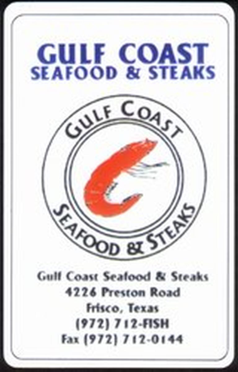 This collectible card features promotional imagery for the Gulf Coast Seafood & Steaks Restaurant located in Frisco, Texas. The card prominently displays the restaurant name “5m Gulf Coast Seafood & Steaks Restaurant” alongside clear branding elements. The design highlights a focus on seafood, specifically shrimp and fish, reflecting the restaurant’s food service offerings. The card is issued by Hello World, Inc., which appears in the card’s layout and adds to the official branding.