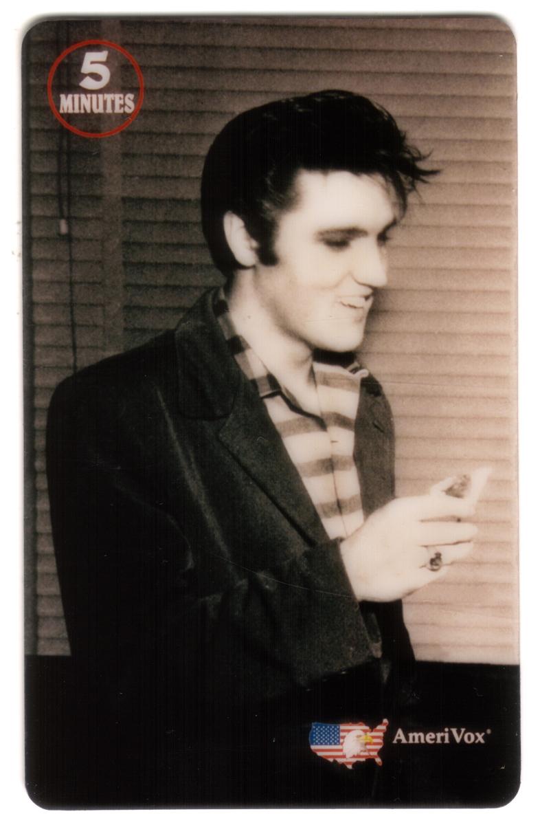 The card displays a circular red emblem in the top left corner indicating "5 MINUTES," which represents the card’s usage value. At the bottom right, the AmeriVox logo appears, accompanied by a small American flag with an eagle, emphasizing the card’s connection to American culture and the entertainment industry. This phone card commemorates Elvis Presley, an American icon known for his contributions to music, film, and popular culture.
