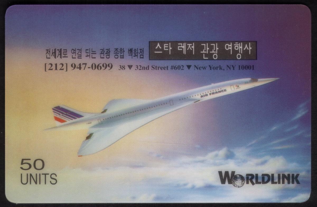 The card also includes text elements such as "50u" indicating its value, and "WorldLink Commun." placed near the bottom, representing the issuing communications company. The design is clean and focused entirely on aviation and transportation themes, emphasizing the iconic supersonic jet.