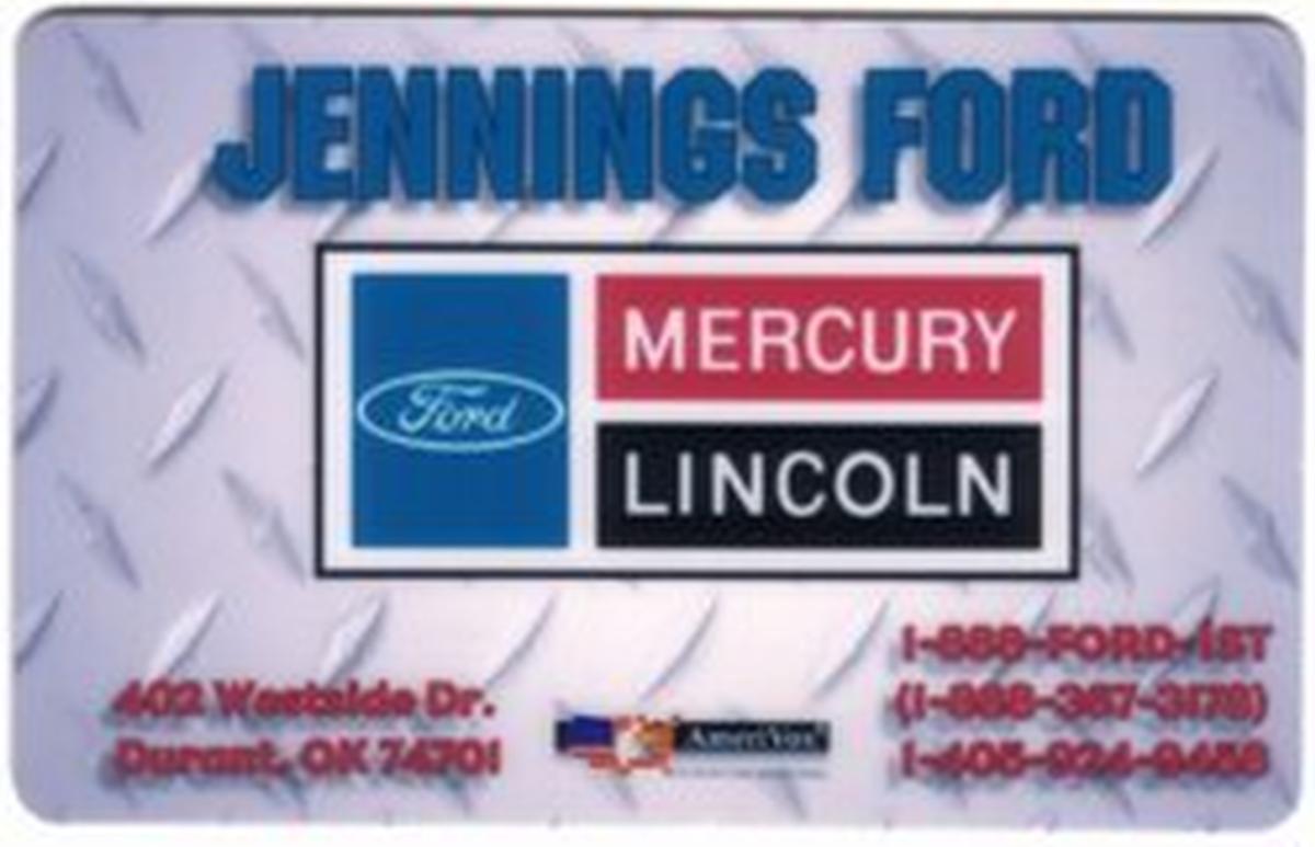 In the background, a weathered sign reads “Steve Jennings Ford Lincoln Mercury,” indicating the Ford, Lincoln, and Mercury dealership operated by Steve Jennings. The sign is mounted on a wooden pole, and the dealership appears to be located in Durant, Oklahoma, as denoted by text integrated into the card’s design. This card commemorates automotive history and highlights the role of local car dealerships in mid-century America.