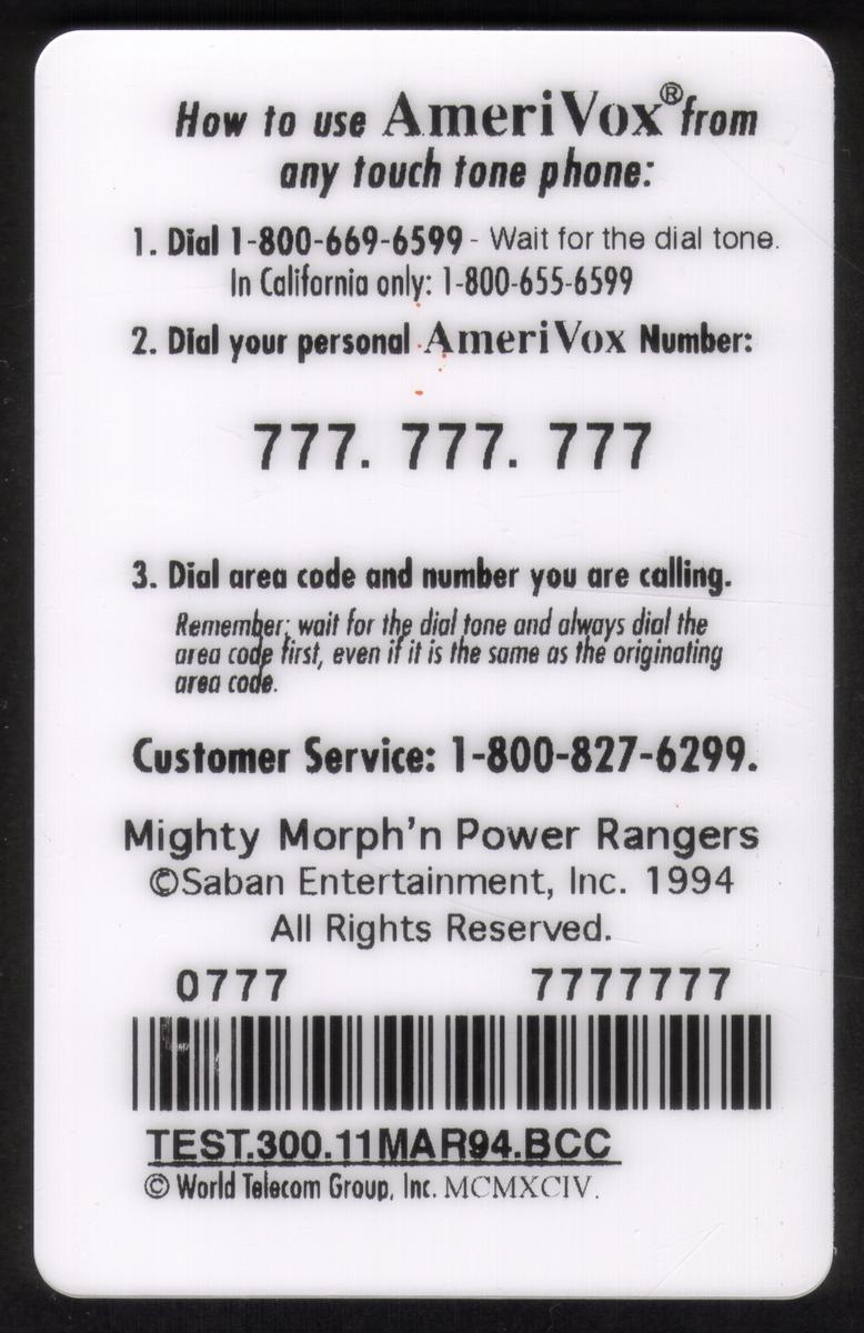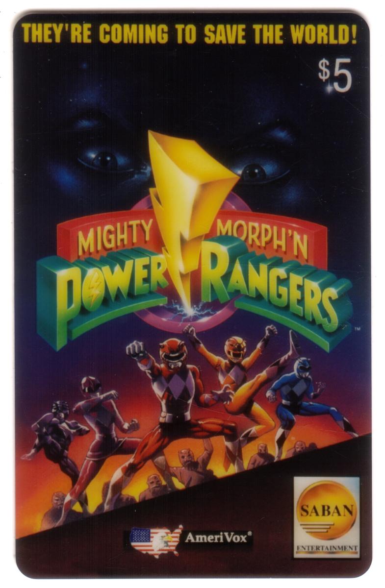 Overall, this card captures the excitement of the Mighty Morphin Power Rangers franchise with vivid colors, recognizable characters, and official branding from Saban Entertainment and AmeriVox. It is designed for fans and collectors interested in entertainment-themed collectible phone cards.