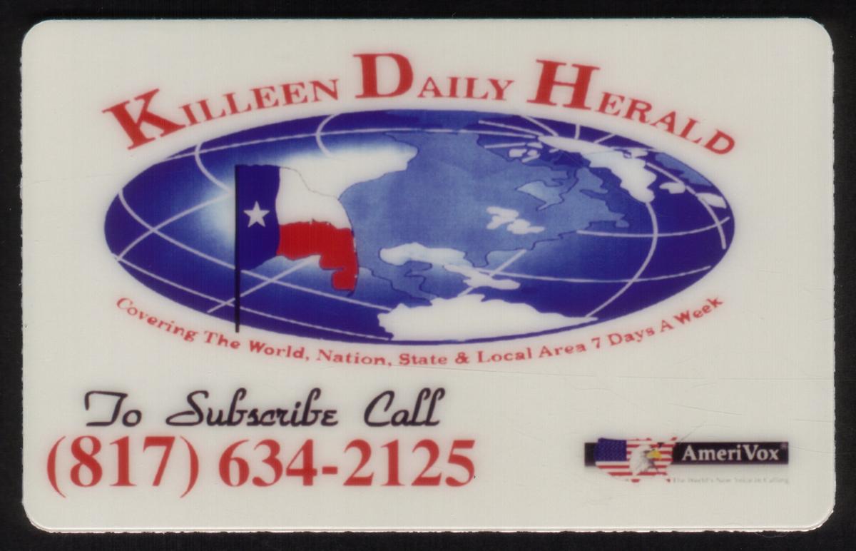 Overall, the card highlights the partnership between AmeriVox and the Killeen Daily Herald, emphasizing daily news delivery in both local and broader contexts, seven days a week. The inclusion of the Republic of Texas flag serves as a unique regional identifier on the card.