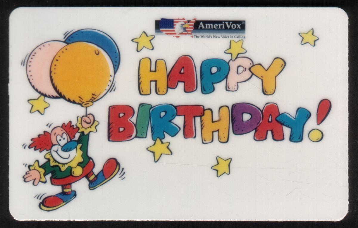 Centered toward the upper right area of the card is the bold red text "$20. Happy Birthday" in a playful font that complements the birthday theme. Beneath the large greeting, the smaller text reads "AmeriVox (09/94)," indicating the issuing company and the date associated with the card. The entire design suggests a celebration of birthdays with joyful sentiments, clowns, stars, and colorful balloons all combining to create a festive and upbeat presentation.