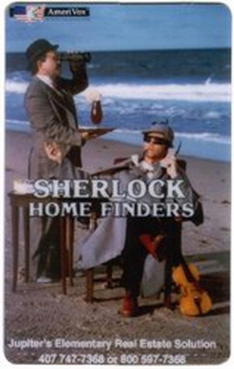 Text on the card includes the phrases "Jupiter's Elementary Real Estate Solution" and "Sherlock Home Finders," indicating a connection to real estate rentals, management, and sales in Jupiter, Florida. The card also includes the brand or company name AmeriVox, positioned prominently. The background includes sand and water, complementing the beach theme, while the foreground elements focus on real estate and leisure.