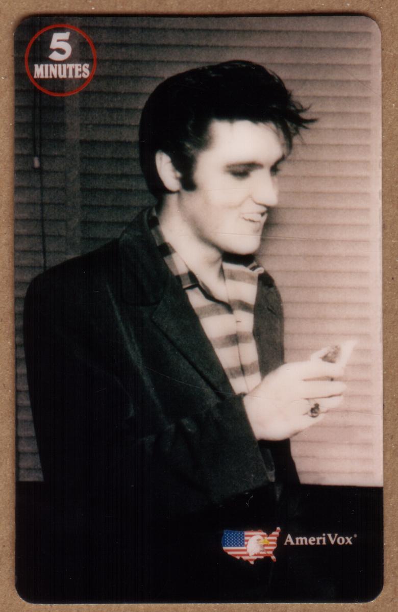 Black-and-white Elvis Presley image with 5-minute prepaid value, American icon, 1950s cultural history, charity legacy, vintage collectible telephony memorabilia |