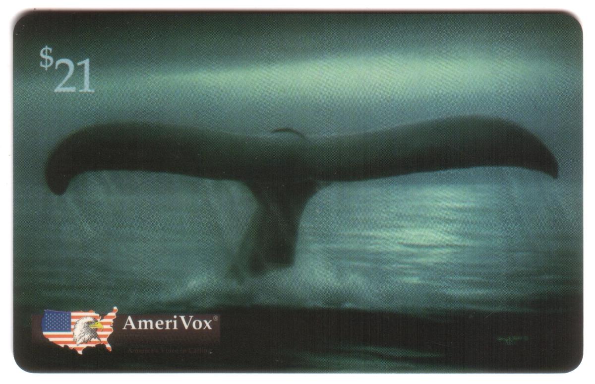 The card’s value is marked as $21 in the top left corner. The lower left side includes a small graphic of the United States map with an eagle's head overlay and the text "AmeriVox." In the lower right corner, there is a signature that reads "Wyland," identifying the renowned marine life artist. The card’s imagery and design celebrate whales as majestic marine mammals, fitting with themes of wildlife, marine animals, and endangered species.