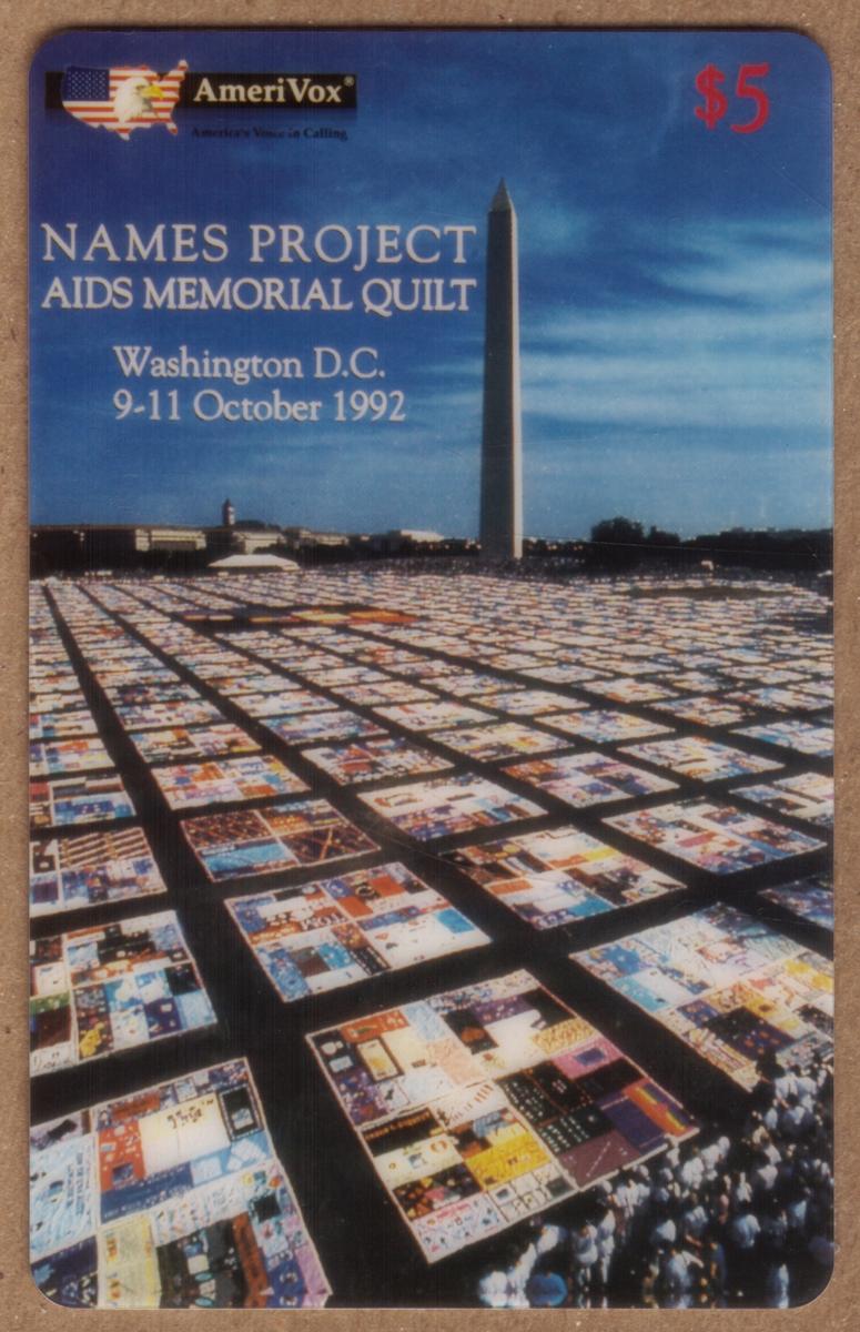 At the center of the card’s layout, quilt patterns are clearly displayed, representing the individual memorials created as part of the charity's tribute to those affected by AIDS. The artwork emphasizes human connection through the depiction of hands and watchful eyes, reinforcing themes of care, memory, and solidarity. The text on the card identifies it as a prototype test issued by AmeriVox, suggesting its role in a fundraising initiative.