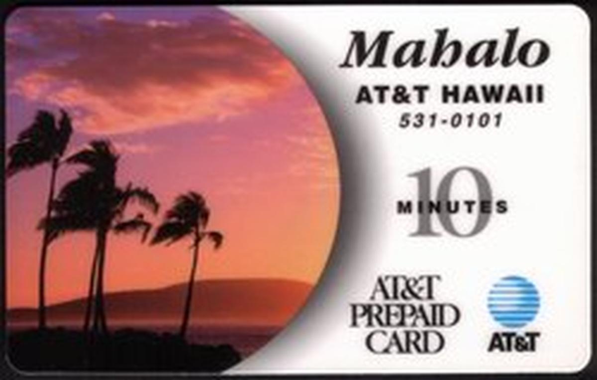 Overall, the card is a promotional phone card with a visual focus on Hawaiian landscapes, symbolized through the five palm trees, the mountainous horizon, and the sky with clouds. The combination of these elements and the clear labeling creates a distinct representation of AT&T’s connection to Hawaii.