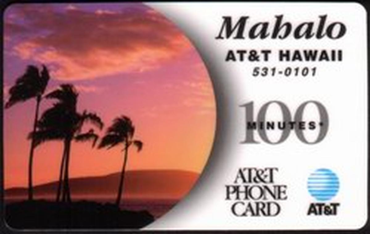 Overall, the card highlights natural elements such as palm trees, mountains, a partly cloudy sky, and clear daylight, connected with the AT&T branding and Hawaiian theme.