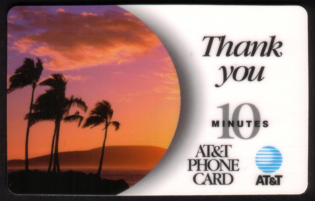 This collectible phone card has a tropical aesthetic with a focus on nature, sky, and gratitude. It is specifically designed to provide 10 minutes of phone service using the AT&T network.