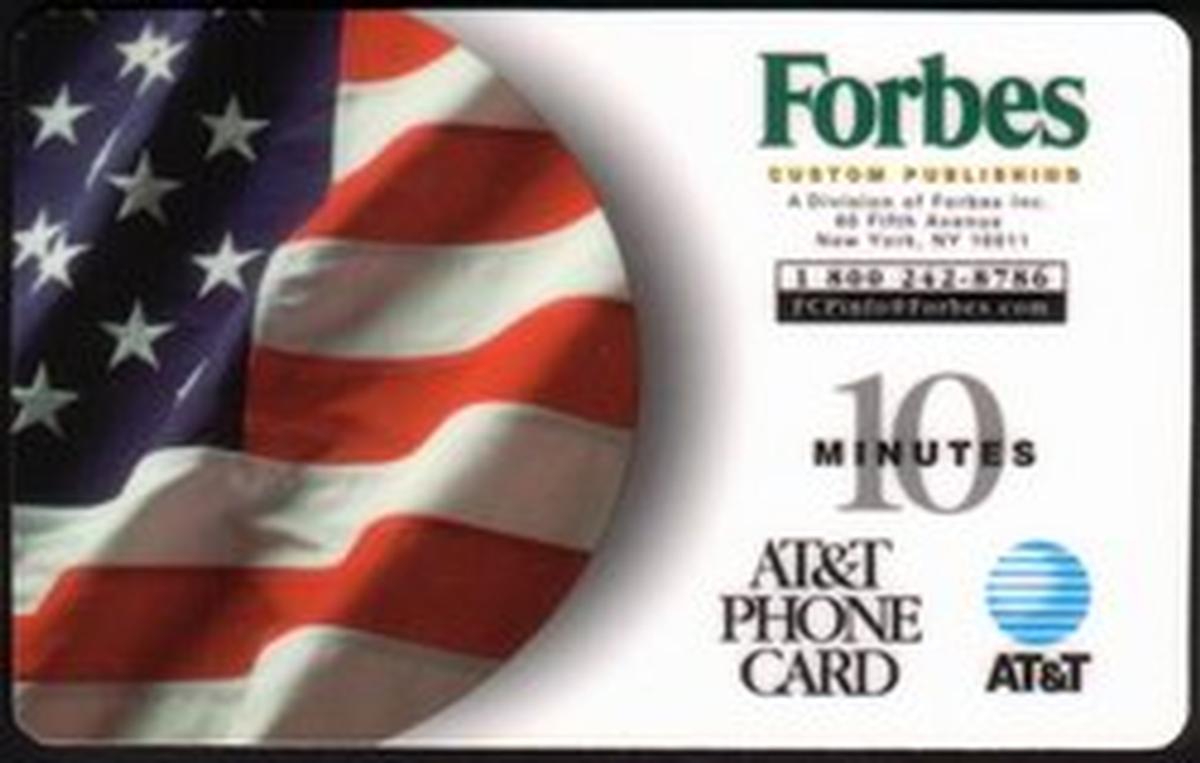 The design includes a subtle business theme, consistent with Forbes’ reputation in the financial and business world. The colors of the American flag include the traditional red, white, and blue, emphasizing patriotism. The card’s layout is clean and formal, reflecting the professional image associated with Forbes and AT&T.