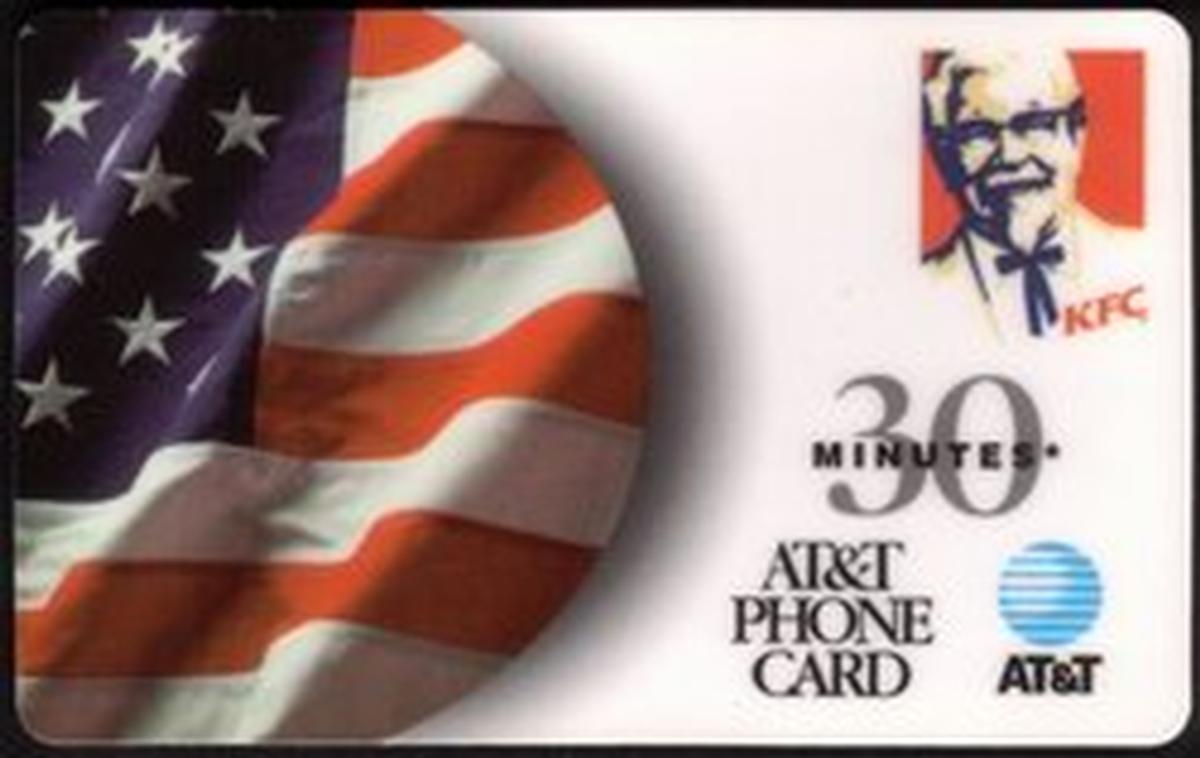 This card’s composition clearly links Colonel Sanders and KFC’s American heritage, boosted by the presence of the American flag in the logo. The inclusion of the AT&T logo and the words “30m” denote that this is a prepaid phone card with 30 minutes of phone time. The card serves as both a collectible item and a functional prepaid phone card, combining corporate branding with communication utility.