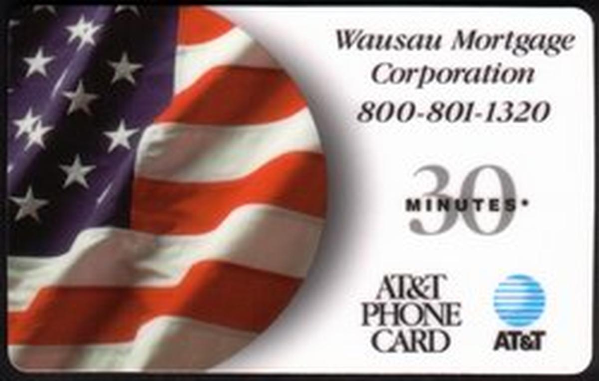 The card is a 30-minute phone card, as shown by the “30m” marking, confirming its intended use for timed phone service. The key elements—American flag, Wausau Mortgage Corporation name, SPECIMEN designation, 30-minute duration, and AT&T logo—are clearly arranged to create a cohesive and professional appearance that highlights both patriotism and commercial sponsorship.
