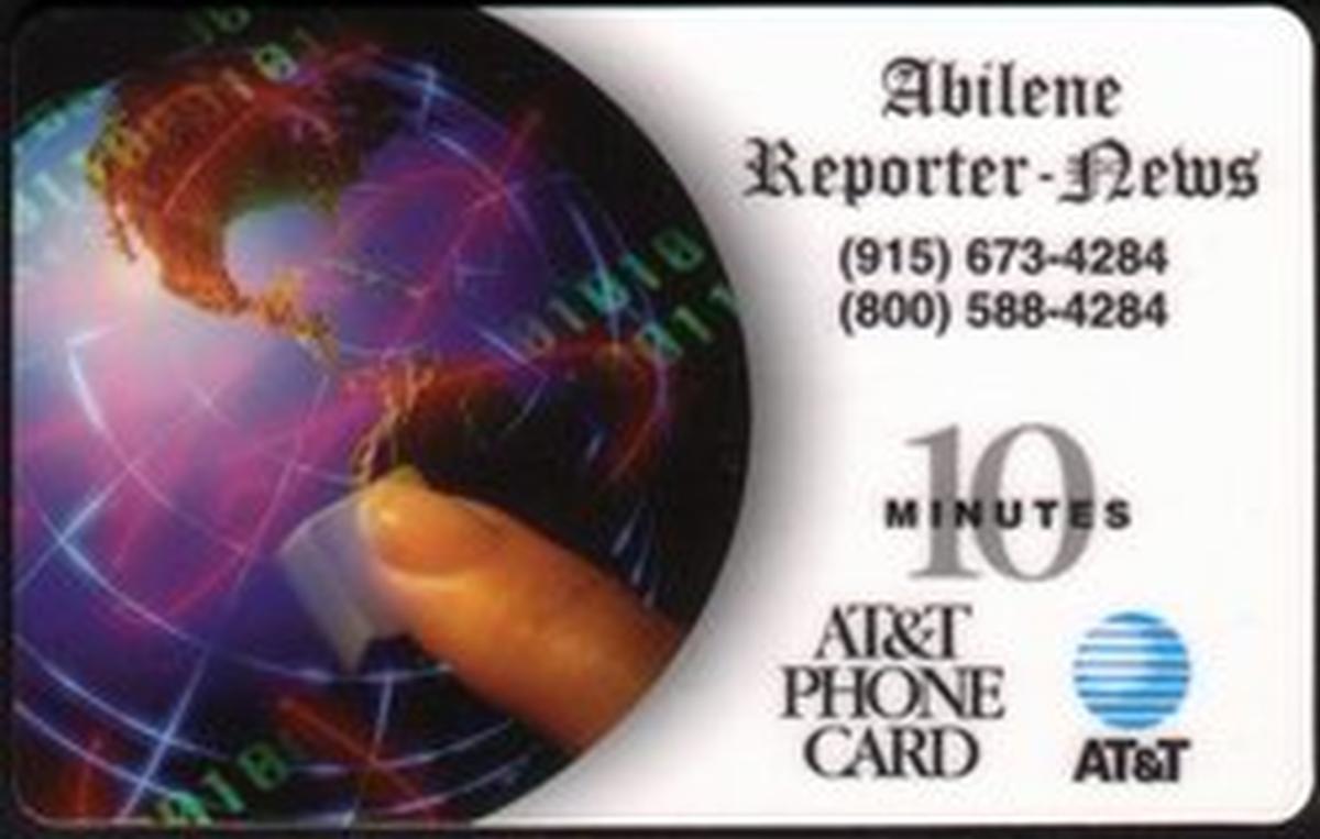 This collectible phone card features a detailed graphic centered around the theme of business and communication as represented through several distinct elements. At the forefront is a stylized illustration of a world globe intersected by a dialing finger, symbolizing global connectivity and telecommunications. Adjacent to this, the card prominently displays the name "Abilene Reporter News," indicating a connection to the Texas-based newspaper published in Abilene. The layout includes elements resembling a newspaper design, reinforcing the association with news media.