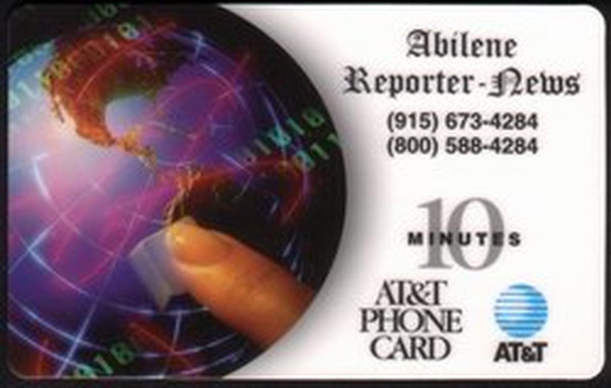 The imagery and text reflect an emphasis on information and connectivity, consistent with the theme of news and telecommunications. The globe and dialing finger elements highlight worldwide telecommunication and may reference the telephone dialing process. The card’s layout combines a business-oriented and promotional concept centered on AT&T and the Abilene Reporter News, thus appealing to collectors interested in corporate or regional media memorabilia.