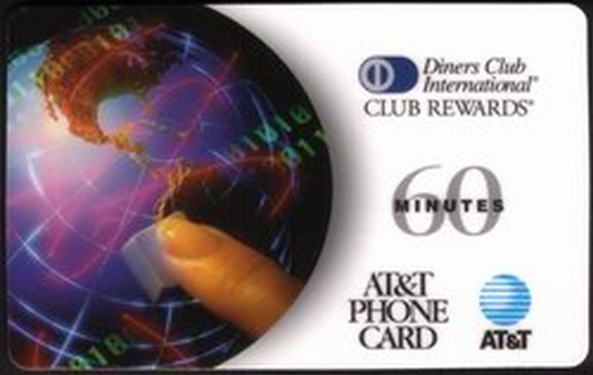 No additional imagery or artistic elements appear on the card aside from the globe, dialing finger, and the informative text relating to the Diners Club Rewards and AT&T branding. The card’s layout is functional and focused on showcasing the partnership and utility between AT&T and Diners Club International.