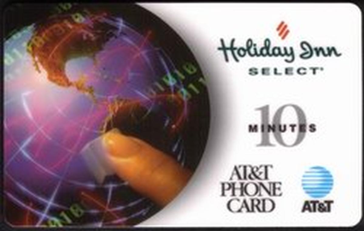 No other decorative elements or images are present on the card apart from the business and travel-related symbols and brand names. The card’s design emphasizes its use as a promotional item associated with the Holiday Inn Select hotel, business travel, and AT&T telecommunications services, making it a collectible phone card targeted at business travelers.