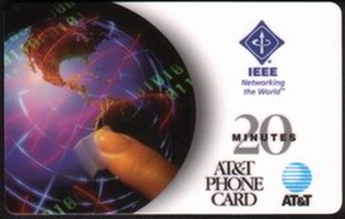 Additional branding includes the AT&T logo and the word "SPECIMEN," indicating this card is a sample or promotional item. The combination of organizations and the telecommunications motif ties this card to the electrical engineering profession and the evolution of global communication networks.