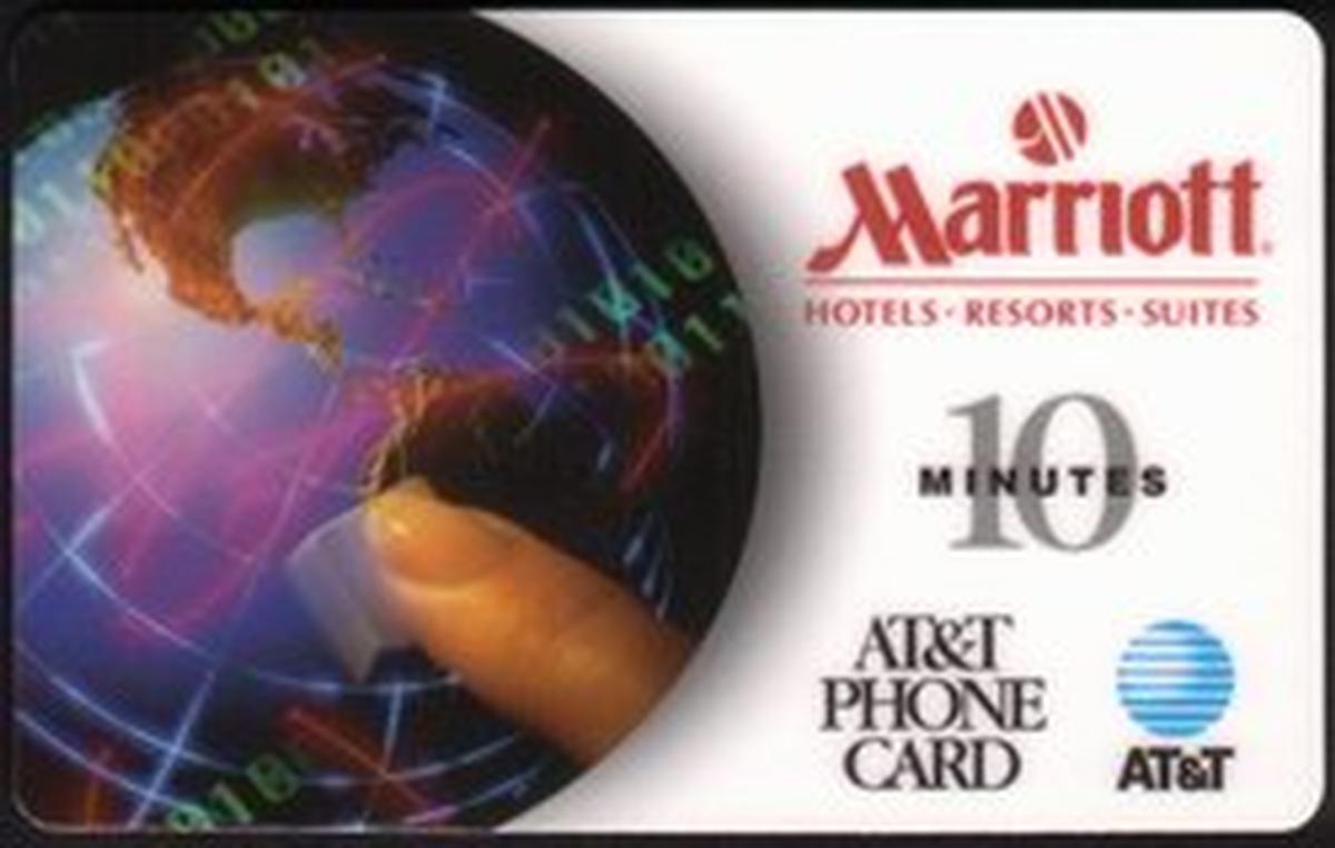 This phone card is part of the promotional series connected to Marriott Hotels and AT&T, designed for telecommunications use. It serves as a collectible item reflecting the collaboration between Marriott Hotels Resorts & Suites and AT&T, highlighting global communication through the globe and dialing finger motif.