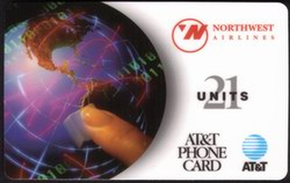 This card reflects a promotional or corporate collaboration between air travel and telecommunications, featuring distinctive branding from both Northwest Airlines and AT&T along with the globe and dialing finger graphic. It fits within the category of collectible phone cards, designed to highlight international travel and communication services.