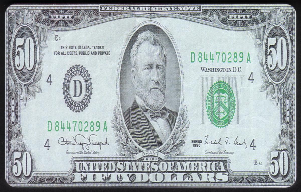 No other text or graphical elements interrupt the focus on President Grant’s portrait and the United States fifty-dollar bill artwork. The card visually connects the topics of American money, currency, federal reserve notes, and collectible phone cards, representing both economic history and telecommunication memorabilia.