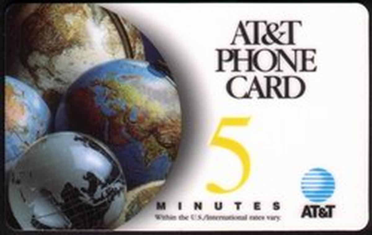 This collectible phone card is issued by AT&T and features a vivid design of five Earth globes arranged horizontally across the card’s center. Each globe is depicted with detailed landmasses and oceanic features, highlighting different views of the planet. The background of the card is a deep blue, complementing the Earth imagery and emphasizing the theme of global connection.