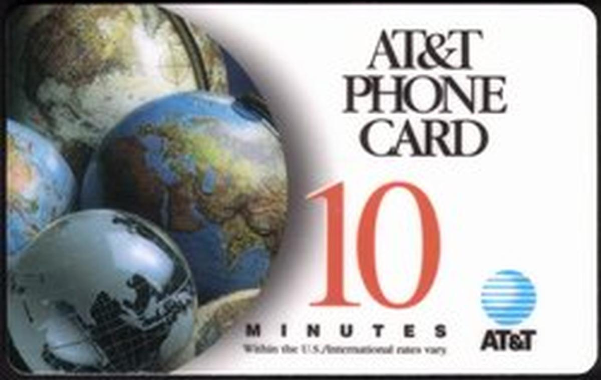The card includes the AT&T logo in the top left corner, clearly marking it as an official AT&T product. Next to the logo, “Phone Card” is printed in white text. Beneath the globes on the lower right side, there is a red rectangular denomination box, indicating the card’s monetary value. The denomination number inside the red box is not present on this card as it is marked SPECIMEN.