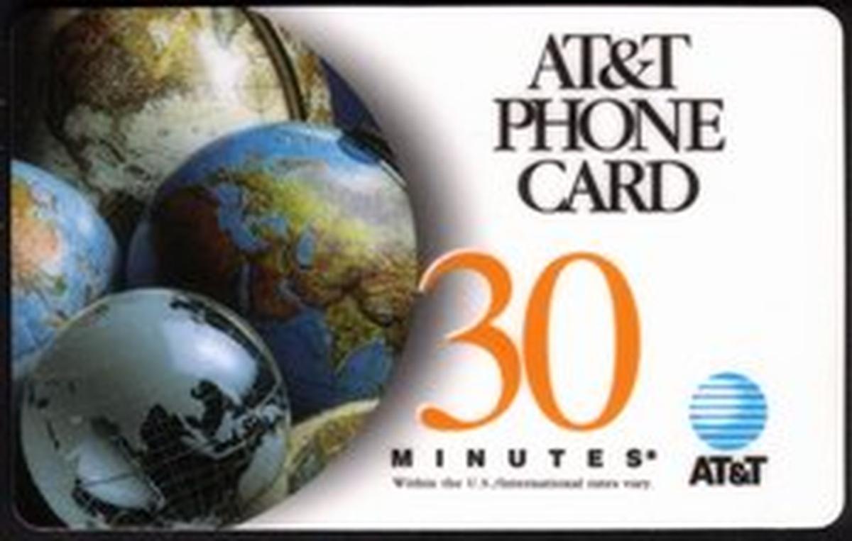 The card also displays the numeric value “30m,” representing 30 minutes of call time, clearly shown on the front. AT&T’s branding is evident, emphasizing the company’s role in telecommunications. The overall aesthetic reflects a focus on worldwide connectivity, as illustrated by the repeated globe images that symbolize global reach.