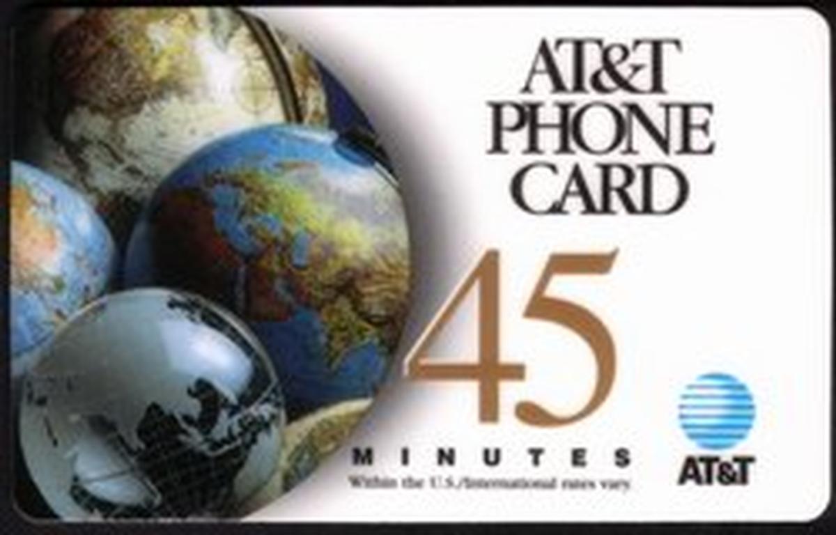 At the top left corner of the card, the AT&T logo is prominently printed in blue, accompanied by the text "AT&T Phone Card" in clear lettering. Near the bottom right, the card displays its value, indicated as "45m," representing 45 minutes of calling time. The card is labeled “SPECIMEN” vertically along the right edge.