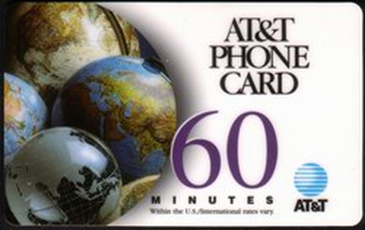 In the top right corner, the AT&T logo appears clearly, confirming the card’s association with the AT&T brand. The text "AT&T Phone Card" is displayed near the upper center part of the card, standing out against the globe imagery with bold, easy-to-read typography. Along the bottom border, the text "World Globes" identifies the theme of the card. The card’s design effectively merges the concepts of global communication and connectivity through the visual presentation of Earth globes alongside AT&T branding.